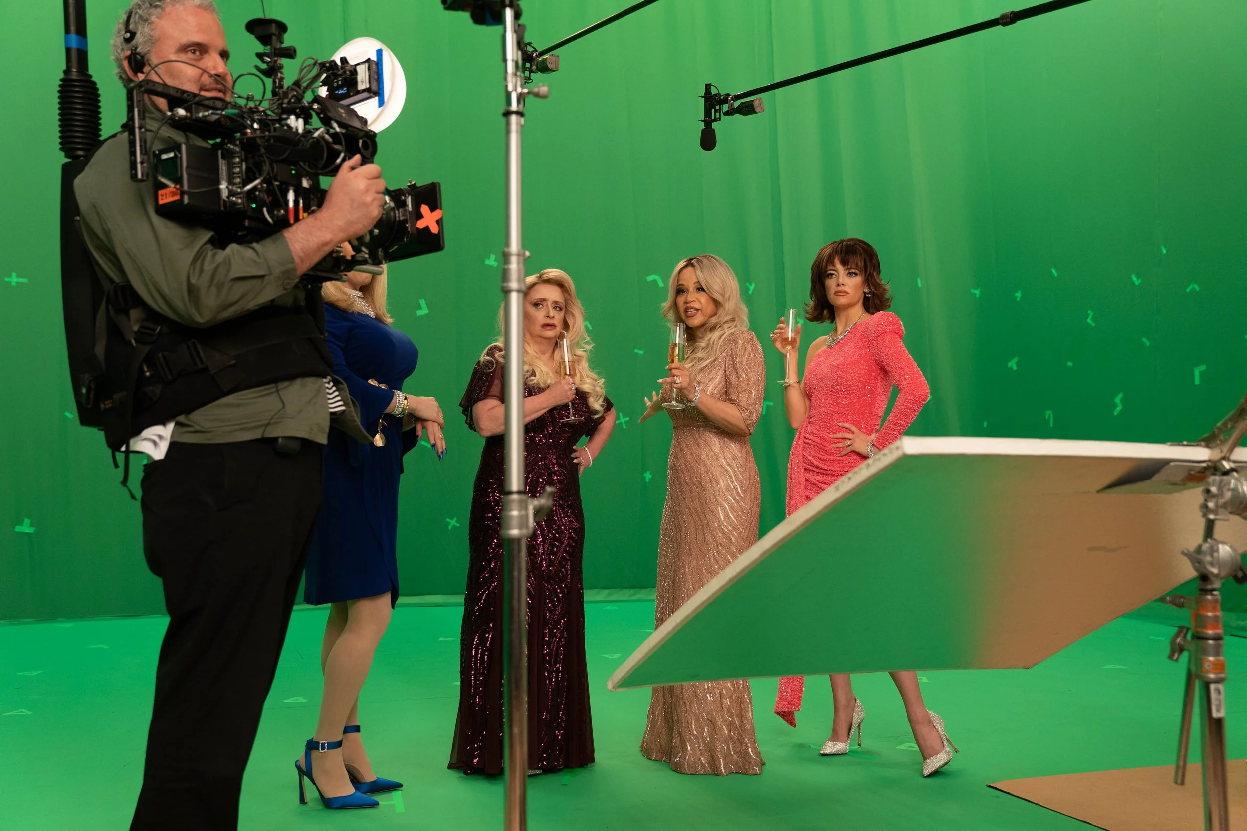 The team tested various backdrops for rear projection and ultimately chose black muslin. While it added texture, it required extensive adjustments to get the lighting just right due to its minimal reflection. During the DI process, Vandercruyssen skillfully isolated and enhanced the projections' colors.